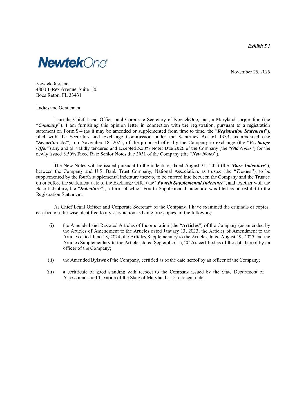 Exhibit 5.1 November 25, 2025 NewtekOne, Inc. 4800 T-Rex Avenue, Suite 120 Boca Raton, FL 33431 Ladies and Gentlemen: I am the Chief Legal Officer and Corporate Secretary of NewtekOne, Inc., a Maryland corporation (the “Company”). I am furnishing this opinion letter in connection with the registration, pursuant to a registration statement on Form S-4 (as it may be amended or supplemented from time to time, the “Registration Statement”), filed with the Securities and Exchange Commission under the Securities Act of 1933, as amended (the “Securities Act”), on November 18, 2025, of the proposed offer by the Company to exchange (the “Exchange Offer”) any and all validly tendered and accepted 5.50% Notes Due 2026 of the Company (the “Old Notes”) for the newly issued 8.50% Fixed Rate Senior Notes due 2031 of the Company (the “New Notes”). The New Notes will be issued pursuant to the indenture, dated August 31, 2023 (the “Base Indenture”), between the Company and U.S. Bank Trust Company, National Association, as trustee (the “Trustee”), to be supplemented by the fourth supplemental indenture thereto, to be entered into between the Company and the Trustee on or before the settlement date of the Exchange Offer (the “Fourth Supplemental Indenture”, and together with the Base Indenture, the “Indenture”), a form of which Fourth Supplemental Indenture was filed as an exhibit to the Registration Statement. As Chief Legal Officer and Corporate Secretary of the Company, I have examined the originals or copies, certified or otherwise identified to my satisfaction as being true copies, of the following: (i) the Amended and Restated Articles of Incorporation (the “Articles”) of the Company (as amended by the Articles of Amendment to the Articles dated January 13, 2023, the Articles of Amendment to the Articles dated June 18, 2024, the Articles Supplementary to the Articles dated August 19, 2025 and the Articles Supplementary to the Articles dated September 16, 2025), certified as of the date hereof by an officer of the Company; (ii) the Amended Bylaws of the Company, certified as of the date hereof by an officer of the Company; (iii) a certificate of good standing with respect to the Company issued by the State Department of Assessments and Taxation of the State of Maryland as of a recent date;