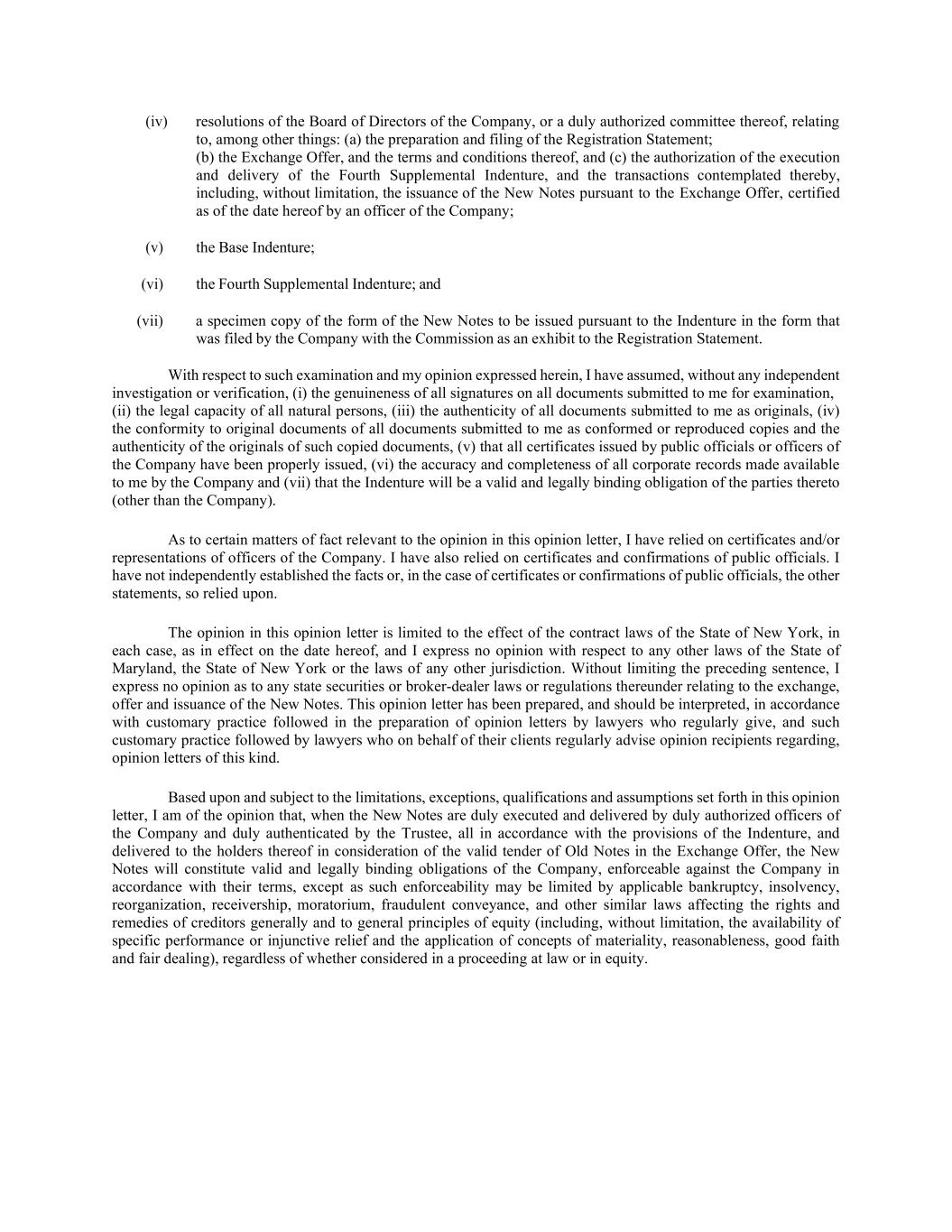 (iv) resolutions of the Board of Directors of the Company, or a duly authorized committee thereof, relating to, among other things: (a) the preparation and filing of the Registration Statement; (b) the Exchange Offer, and the terms and conditions thereof, and (c) the authorization of the execution and delivery of the Fourth Supplemental Indenture, and the transactions contemplated thereby, including, without limitation, the issuance of the New Notes pursuant to the Exchange Offer, certified as of the date hereof by an officer of the Company; (v) the Base Indenture; (vi) the Fourth Supplemental Indenture; and (vii) a specimen copy of the form of the New Notes to be issued pursuant to the Indenture in the form that was filed by the Company with the Commission as an exhibit to the Registration Statement. With respect to such examination and my opinion expressed herein, I have assumed, without any independent investigation or verification, (i) the genuineness of all signatures on all documents submitted to me for examination, (ii) the legal capacity of all natural persons, (iii) the authenticity of all documents submitted to me as originals, (iv) the conformity to original documents of all documents submitted to me as conformed or reproduced copies and the authenticity of the originals of such copied documents, (v) that all certificates issued by public officials or officers of the Company have been properly issued, (vi) the accuracy and completeness of all corporate records made available to me by the Company and (vii) that the Indenture will be a valid and legally binding obligation of the parties thereto (other than the Company). As to certain matters of fact relevant to the opinion in this opinion letter, I have relied on certificates and/or representations of officers of the Company. I have also relied on certificates and confirmations of public officials. I have not independently established the facts or, in the case of certificates or confirmations of public officials, the other statements, so relied upon. The opinion in this opinion letter is limited to the effect of the contract laws of the State of New York, in each case, as in effect on the date hereof, and I express no opinion with respect to any other laws of the State of Maryland, the State of New York or the laws of any other jurisdiction. Without limiting the preceding sentence, I express no opinion as to any state securities or broker-dealer laws or regulations thereunder relating to the exchange, offer and issuance of the New Notes. This opinion letter has been prepared, and should be interpreted, in accordance with customary practice followed in the preparation of opinion letters by lawyers who regularly give, and such customary practice followed by lawyers who on behalf of their clients regularly advise opinion recipients regarding, opinion letters of this kind. Based upon and subject to the limitations, exceptions, qualifications and assumptions set forth in this opinion letter, I am of the opinion that, when the New Notes are duly executed and delivered by duly authorized officers of the Company and duly authenticated by the Trustee, all in accordance with the provisions of the Indenture, and delivered to the holders thereof in consideration of the valid tender of Old Notes in the Exchange Offer, the New Notes will constitute valid and legally binding obligations of the Company, enforceable against the Company in accordance with their terms, except as such enforceability may be limited by applicable bankruptcy, insolvency, reorganization, receivership, moratorium, fraudulent conveyance, and other similar laws affecting the rights and remedies of creditors generally and to general principles of equity (including, without limitation, the availability of specific performance or injunctive relief and the application of concepts of materiality, reasonableness, good faith and fair dealing), regardless of whether considered in a proceeding at law or in equity.
