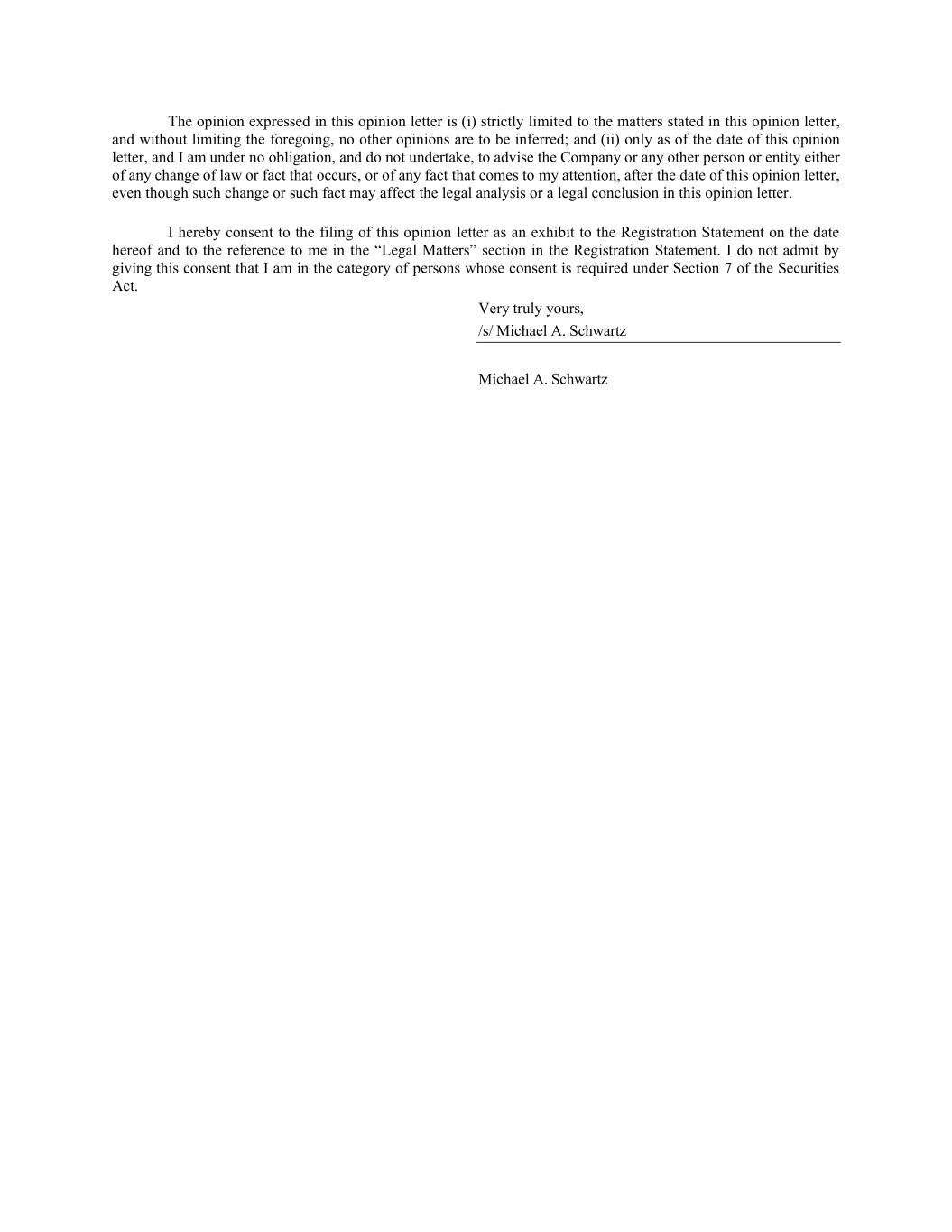 The opinion expressed in this opinion letter is (i) strictly limited to the matters stated in this opinion letter, and without limiting the foregoing, no other opinions are to be inferred; and (ii) only as of the date of this opinion letter, and I am under no obligation, and do not undertake, to advise the Company or any other person or entity either of any change of law or fact that occurs, or of any fact that comes to my attention, after the date of this opinion letter, even though such change or such fact may affect the legal analysis or a legal conclusion in this opinion letter. I hereby consent to the filing of this opinion letter as an exhibit to the Registration Statement on the date hereof and to the reference to me in the “Legal Matters” section in the Registration Statement. I do not admit by giving this consent that I am in the category of persons whose consent is required under Section 7 of the Securities Act. Very truly yours, /s/ Michael A. Schwartz Michael A. Schwartz