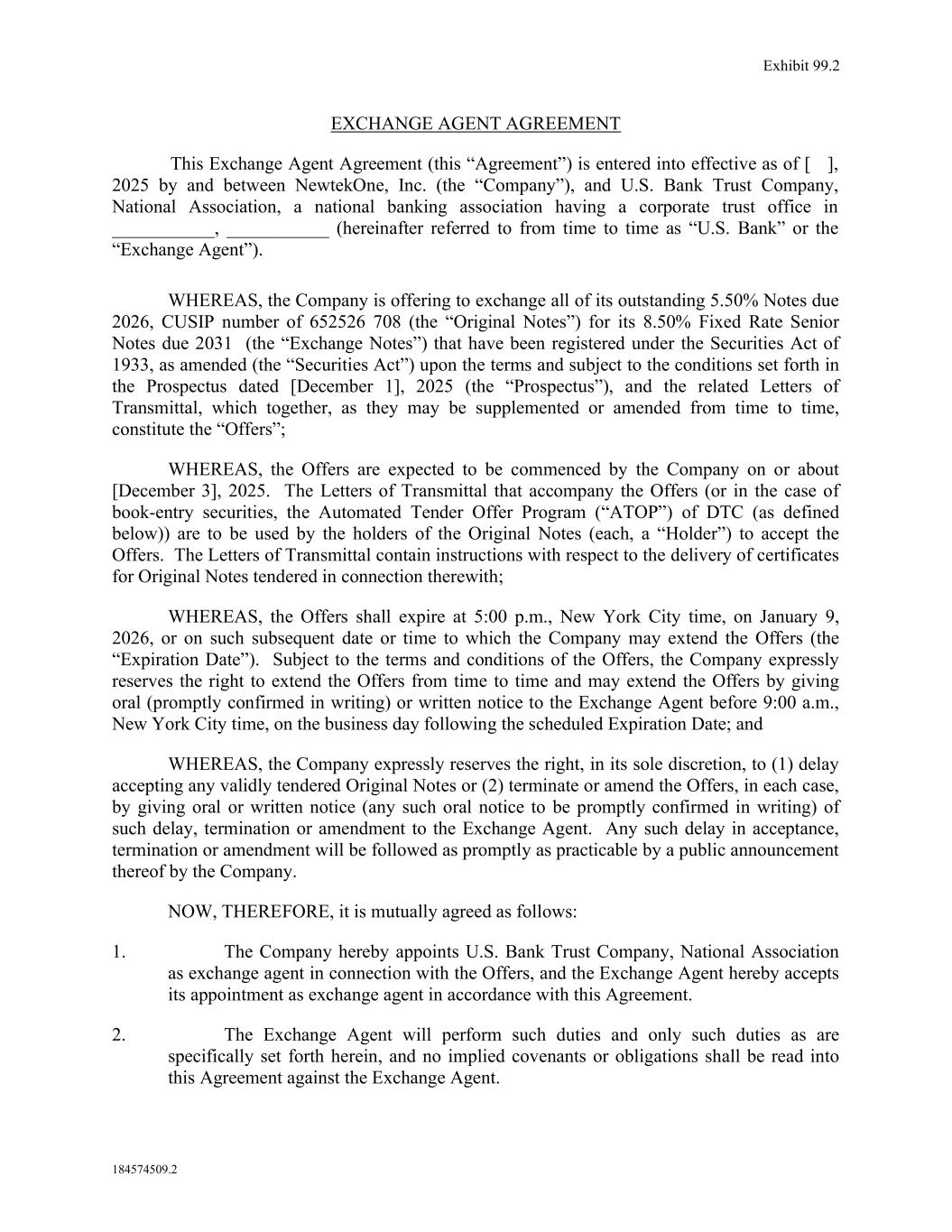 Exhibit 99.2 184574509.2 EXCHANGE AGENT AGREEMENT This Exchange Agent Agreement (this “Agreement”) is entered into effective as of [ ], 2025 by and between NewtekOne, Inc. (the “Company”), and U.S. Bank Trust Company, National Association, a national banking association having a corporate trust office in ___________, ___________ (hereinafter referred to from time to time as “U.S. Bank” or the “Exchange Agent”). WHEREAS, the Company is offering to exchange all of its outstanding 5.50% Notes due 2026, CUSIP number of 652526 708 (the “Original Notes”) for its 8.50% Fixed Rate Senior Notes due 2031 (the “Exchange Notes”) that have been registered under the Securities Act of 1933, as amended (the “Securities Act”) upon the terms and subject to the conditions set forth in the Prospectus dated [December 1], 2025 (the “Prospectus”), and the related Letters of Transmittal, which together, as they may be supplemented or amended from time to time, constitute the “Offers”; WHEREAS, the Offers are expected to be commenced by the Company on or about [December 3], 2025. The Letters of Transmittal that accompany the Offers (or in the case of book-entry securities, the Automated Tender Offer Program (“ATOP”) of DTC (as defined below)) are to be used by the holders of the Original Notes (each, a “Holder”) to accept the Offers. The Letters of Transmittal contain instructions with respect to the delivery of certificates for Original Notes tendered in connection therewith; WHEREAS, the Offers shall expire at 5:00 p.m., New York City time, on January 9, 2026, or on such subsequent date or time to which the Company may extend the Offers (the “Expiration Date”). Subject to the terms and conditions of the Offers, the Company expressly reserves the right to extend the Offers from time to time and may extend the Offers by giving oral (promptly confirmed in writing) or written notice to the Exchange Agent before 9:00 a.m., New York City time, on the business day following the scheduled Expiration Date; and WHEREAS, the Company expressly reserves the right, in its sole discretion, to (1) delay accepting any validly tendered Original Notes or (2) terminate or amend the Offers, in each case, by giving oral or written notice (any such oral notice to be promptly confirmed in writing) of such delay, termination or amendment to the Exchange Agent. Any such delay in acceptance, termination or amendment will be followed as promptly as practicable by a public announcement thereof by the Company. NOW, THEREFORE, it is mutually agreed as follows: 1. The Company hereby appoints U.S. Bank Trust Company, National Association as exchange agent in connection with the Offers, and the Exchange Agent hereby accepts its appointment as exchange agent in accordance with this Agreement. 2. The Exchange Agent will perform such duties and only such duties as are specifically set forth herein, and no implied covenants or obligations shall be read into this Agreement against the Exchange Agent.