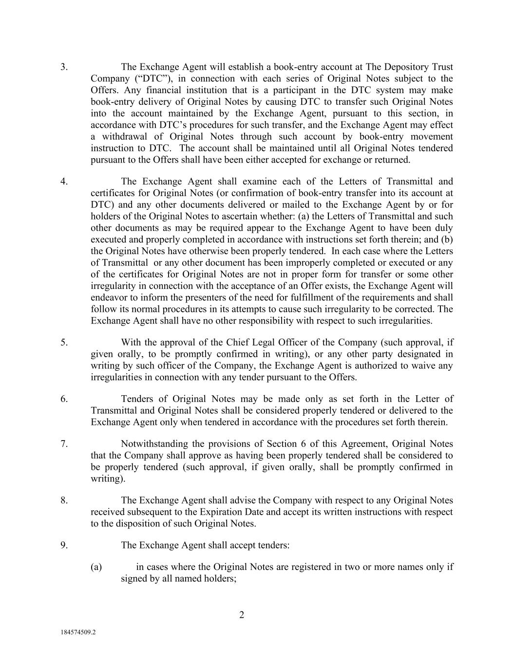 2 184574509.2 3. The Exchange Agent will establish a book-entry account at The Depository Trust Company (“DTC”), in connection with each series of Original Notes subject to the Offers. Any financial institution that is a participant in the DTC system may make book-entry delivery of Original Notes by causing DTC to transfer such Original Notes into the account maintained by the Exchange Agent, pursuant to this section, in accordance with DTC’s procedures for such transfer, and the Exchange Agent may effect a withdrawal of Original Notes through such account by book-entry movement instruction to DTC. The account shall be maintained until all Original Notes tendered pursuant to the Offers shall have been either accepted for exchange or returned. 4. The Exchange Agent shall examine each of the Letters of Transmittal and certificates for Original Notes (or confirmation of book-entry transfer into its account at DTC) and any other documents delivered or mailed to the Exchange Agent by or for holders of the Original Notes to ascertain whether: (a) the Letters of Transmittal and such other documents as may be required appear to the Exchange Agent to have been duly executed and properly completed in accordance with instructions set forth therein; and (b) the Original Notes have otherwise been properly tendered. In each case where the Letters of Transmittal or any other document has been improperly completed or executed or any of the certificates for Original Notes are not in proper form for transfer or some other irregularity in connection with the acceptance of an Offer exists, the Exchange Agent will endeavor to inform the presenters of the need for fulfillment of the requirements and shall follow its normal procedures in its attempts to cause such irregularity to be corrected. The Exchange Agent shall have no other responsibility with respect to such irregularities. 5. With the approval of the Chief Legal Officer of the Company (such approval, if given orally, to be promptly confirmed in writing), or any other party designated in writing by such officer of the Company, the Exchange Agent is authorized to waive any irregularities in connection with any tender pursuant to the Offers. 6. Tenders of Original Notes may be made only as set forth in the Letter of Transmittal and Original Notes shall be considered properly tendered or delivered to the Exchange Agent only when tendered in accordance with the procedures set forth therein. 7. Notwithstanding the provisions of Section 6 of this Agreement, Original Notes that the Company shall approve as having been properly tendered shall be considered to be properly tendered (such approval, if given orally, shall be promptly confirmed in writing). 8. The Exchange Agent shall advise the Company with respect to any Original Notes received subsequent to the Expiration Date and accept its written instructions with respect to the disposition of such Original Notes. 9. The Exchange Agent shall accept tenders: (a) in cases where the Original Notes are registered in two or more names only if signed by all named holders;