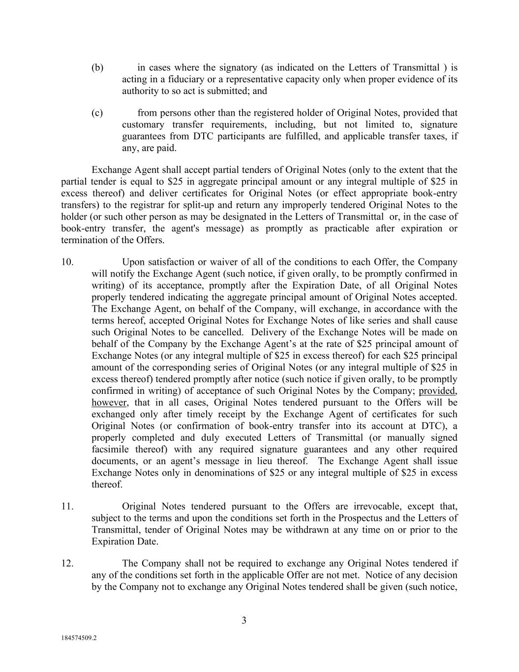 3 184574509.2 (b) in cases where the signatory (as indicated on the Letters of Transmittal ) is acting in a fiduciary or a representative capacity only when proper evidence of its authority to so act is submitted; and (c) from persons other than the registered holder of Original Notes, provided that customary transfer requirements, including, but not limited to, signature guarantees from DTC participants are fulfilled, and applicable transfer taxes, if any, are paid. Exchange Agent shall accept partial tenders of Original Notes (only to the extent that the partial tender is equal to $25 in aggregate principal amount or any integral multiple of $25 in excess thereof) and deliver certificates for Original Notes (or effect appropriate book-entry transfers) to the registrar for split-up and return any improperly tendered Original Notes to the holder (or such other person as may be designated in the Letters of Transmittal or, in the case of book-entry transfer, the agent's message) as promptly as practicable after expiration or termination of the Offers. 10. Upon satisfaction or waiver of all of the conditions to each Offer, the Company will notify the Exchange Agent (such notice, if given orally, to be promptly confirmed in writing) of its acceptance, promptly after the Expiration Date, of all Original Notes properly tendered indicating the aggregate principal amount of Original Notes accepted. The Exchange Agent, on behalf of the Company, will exchange, in accordance with the terms hereof, accepted Original Notes for Exchange Notes of like series and shall cause such Original Notes to be cancelled. Delivery of the Exchange Notes will be made on behalf of the Company by the Exchange Agent’s at the rate of $25 principal amount of Exchange Notes (or any integral multiple of $25 in excess thereof) for each $25 principal amount of the corresponding series of Original Notes (or any integral multiple of $25 in excess thereof) tendered promptly after notice (such notice if given orally, to be promptly confirmed in writing) of acceptance of such Original Notes by the Company; provided, however, that in all cases, Original Notes tendered pursuant to the Offers will be exchanged only after timely receipt by the Exchange Agent of certificates for such Original Notes (or confirmation of book-entry transfer into its account at DTC), a properly completed and duly executed Letters of Transmittal (or manually signed facsimile thereof) with any required signature guarantees and any other required documents, or an agent’s message in lieu thereof. The Exchange Agent shall issue Exchange Notes only in denominations of $25 or any integral multiple of $25 in excess thereof. 11. Original Notes tendered pursuant to the Offers are irrevocable, except that, subject to the terms and upon the conditions set forth in the Prospectus and the Letters of Transmittal, tender of Original Notes may be withdrawn at any time on or prior to the Expiration Date. 12. The Company shall not be required to exchange any Original Notes tendered if any of the conditions set forth in the applicable Offer are not met. Notice of any decision by the Company not to exchange any Original Notes tendered shall be given (such notice,