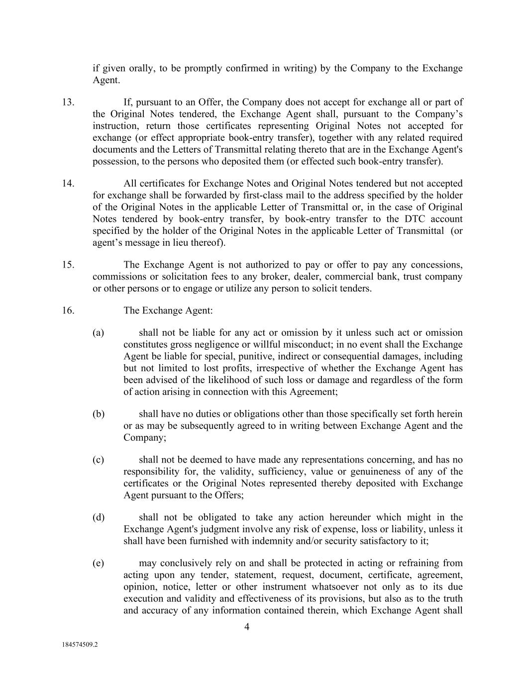 4 184574509.2 if given orally, to be promptly confirmed in writing) by the Company to the Exchange Agent. 13. If, pursuant to an Offer, the Company does not accept for exchange all or part of the Original Notes tendered, the Exchange Agent shall, pursuant to the Company’s instruction, return those certificates representing Original Notes not accepted for exchange (or effect appropriate book-entry transfer), together with any related required documents and the Letters of Transmittal relating thereto that are in the Exchange Agent's possession, to the persons who deposited them (or effected such book-entry transfer). 14. All certificates for Exchange Notes and Original Notes tendered but not accepted for exchange shall be forwarded by first-class mail to the address specified by the holder of the Original Notes in the applicable Letter of Transmittal or, in the case of Original Notes tendered by book-entry transfer, by book-entry transfer to the DTC account specified by the holder of the Original Notes in the applicable Letter of Transmittal (or agent’s message in lieu thereof). 15. The Exchange Agent is not authorized to pay or offer to pay any concessions, commissions or solicitation fees to any broker, dealer, commercial bank, trust company or other persons or to engage or utilize any person to solicit tenders. 16. The Exchange Agent: (a) shall not be liable for any act or omission by it unless such act or omission constitutes gross negligence or willful misconduct; in no event shall the Exchange Agent be liable for special, punitive, indirect or consequential damages, including but not limited to lost profits, irrespective of whether the Exchange Agent has been advised of the likelihood of such loss or damage and regardless of the form of action arising in connection with this Agreement; (b) shall have no duties or obligations other than those specifically set forth herein or as may be subsequently agreed to in writing between Exchange Agent and the Company; (c) shall not be deemed to have made any representations concerning, and has no responsibility for, the validity, sufficiency, value or genuineness of any of the certificates or the Original Notes represented thereby deposited with Exchange Agent pursuant to the Offers; (d) shall not be obligated to take any action hereunder which might in the Exchange Agent's judgment involve any risk of expense, loss or liability, unless it shall have been furnished with indemnity and/or security satisfactory to it; (e) may conclusively rely on and shall be protected in acting or refraining from acting upon any tender, statement, request, document, certificate, agreement, opinion, notice, letter or other instrument whatsoever not only as to its due execution and validity and effectiveness of its provisions, but also as to the truth and accuracy of any information contained therein, which Exchange Agent shall