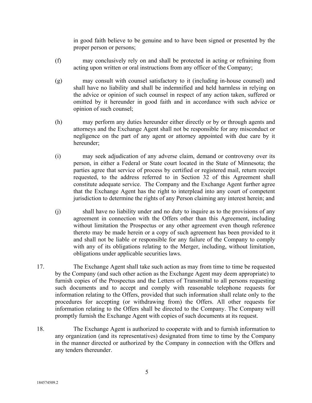 5 184574509.2 in good faith believe to be genuine and to have been signed or presented by the proper person or persons; (f) may conclusively rely on and shall be protected in acting or refraining from acting upon written or oral instructions from any officer of the Company; (g) may consult with counsel satisfactory to it (including in-house counsel) and shall have no liability and shall be indemnified and held harmless in relying on the advice or opinion of such counsel in respect of any action taken, suffered or omitted by it hereunder in good faith and in accordance with such advice or opinion of such counsel; (h) may perform any duties hereunder either directly or by or through agents and attorneys and the Exchange Agent shall not be responsible for any misconduct or negligence on the part of any agent or attorney appointed with due care by it hereunder; (i) may seek adjudication of any adverse claim, demand or controversy over its person, in either a Federal or State court located in the State of Minnesota; the parties agree that service of process by certified or registered mail, return receipt requested, to the address referred to in Section 32 of this Agreement shall constitute adequate service. The Company and the Exchange Agent further agree that the Exchange Agent has the right to interplead into any court of competent jurisdiction to determine the rights of any Person claiming any interest herein; and (j) shall have no liability under and no duty to inquire as to the provisions of any agreement in connection with the Offers other than this Agreement, including without limitation the Prospectus or any other agreement even though reference thereto may be made herein or a copy of such agreement has been provided to it and shall not be liable or responsible for any failure of the Company to comply with any of its obligations relating to the Merger, including, without limitation, obligations under applicable securities laws. 17. The Exchange Agent shall take such action as may from time to time be requested by the Company (and such other action as the Exchange Agent may deem appropriate) to furnish copies of the Prospectus and the Letters of Transmittal to all persons requesting such documents and to accept and comply with reasonable telephone requests for information relating to the Offers, provided that such information shall relate only to the procedures for accepting (or withdrawing from) the Offers. All other requests for information relating to the Offers shall be directed to the Company. The Company will promptly furnish the Exchange Agent with copies of such documents at its request. 18. The Exchange Agent is authorized to cooperate with and to furnish information to any organization (and its representatives) designated from time to time by the Company in the manner directed or authorized by the Company in connection with the Offers and any tenders thereunder.