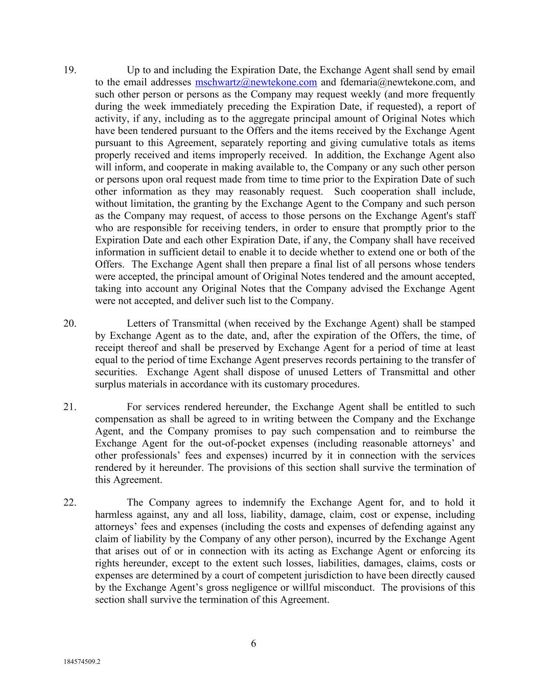 6 184574509.2 19. Up to and including the Expiration Date, the Exchange Agent shall send by email to the email addresses mschwartz@newtekone.com and fdemaria@newtekone.com, and such other person or persons as the Company may request weekly (and more frequently during the week immediately preceding the Expiration Date, if requested), a report of activity, if any, including as to the aggregate principal amount of Original Notes which have been tendered pursuant to the Offers and the items received by the Exchange Agent pursuant to this Agreement, separately reporting and giving cumulative totals as items properly received and items improperly received. In addition, the Exchange Agent also will inform, and cooperate in making available to, the Company or any such other person or persons upon oral request made from time to time prior to the Expiration Date of such other information as they may reasonably request. Such cooperation shall include, without limitation, the granting by the Exchange Agent to the Company and such person as the Company may request, of access to those persons on the Exchange Agent's staff who are responsible for receiving tenders, in order to ensure that promptly prior to the Expiration Date and each other Expiration Date, if any, the Company shall have received information in sufficient detail to enable it to decide whether to extend one or both of the Offers. The Exchange Agent shall then prepare a final list of all persons whose tenders were accepted, the principal amount of Original Notes tendered and the amount accepted, taking into account any Original Notes that the Company advised the Exchange Agent were not accepted, and deliver such list to the Company. 20. Letters of Transmittal (when received by the Exchange Agent) shall be stamped by Exchange Agent as to the date, and, after the expiration of the Offers, the time, of receipt thereof and shall be preserved by Exchange Agent for a period of time at least equal to the period of time Exchange Agent preserves records pertaining to the transfer of securities. Exchange Agent shall dispose of unused Letters of Transmittal and other surplus materials in accordance with its customary procedures. 21. For services rendered hereunder, the Exchange Agent shall be entitled to such compensation as shall be agreed to in writing between the Company and the Exchange Agent, and the Company promises to pay such compensation and to reimburse the Exchange Agent for the out-of-pocket expenses (including reasonable attorneys’ and other professionals’ fees and expenses) incurred by it in connection with the services rendered by it hereunder. The provisions of this section shall survive the termination of this Agreement. 22. The Company agrees to indemnify the Exchange Agent for, and to hold it harmless against, any and all loss, liability, damage, claim, cost or expense, including attorneys’ fees and expenses (including the costs and expenses of defending against any claim of liability by the Company of any other person), incurred by the Exchange Agent that arises out of or in connection with its acting as Exchange Agent or enforcing its rights hereunder, except to the extent such losses, liabilities, damages, claims, costs or expenses are determined by a court of competent jurisdiction to have been directly caused by the Exchange Agent’s gross negligence or willful misconduct. The provisions of this section shall survive the termination of this Agreement.