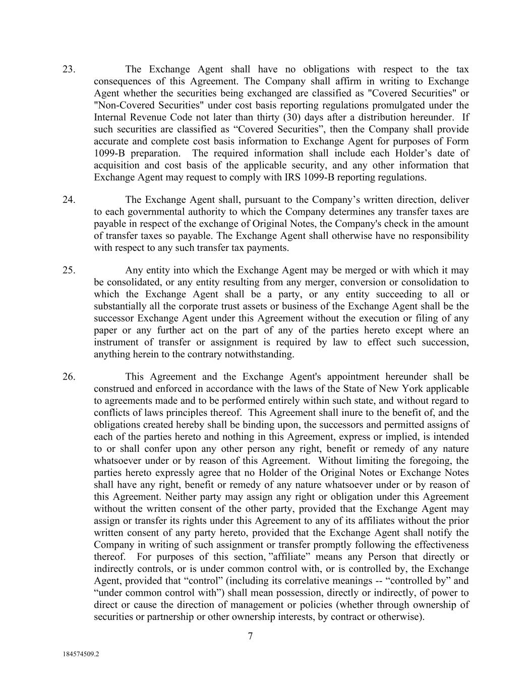 7 184574509.2 23. The Exchange Agent shall have no obligations with respect to the tax consequences of this Agreement. The Company shall affirm in writing to Exchange Agent whether the securities being exchanged are classified as "Covered Securities" or "Non-Covered Securities" under cost basis reporting regulations promulgated under the Internal Revenue Code not later than thirty (30) days after a distribution hereunder. If such securities are classified as “Covered Securities”, then the Company shall provide accurate and complete cost basis information to Exchange Agent for purposes of Form 1099-B preparation. The required information shall include each Holder’s date of acquisition and cost basis of the applicable security, and any other information that Exchange Agent may request to comply with IRS 1099-B reporting regulations. 24. The Exchange Agent shall, pursuant to the Company’s written direction, deliver to each governmental authority to which the Company determines any transfer taxes are payable in respect of the exchange of Original Notes, the Company's check in the amount of transfer taxes so payable. The Exchange Agent shall otherwise have no responsibility with respect to any such transfer tax payments. 25. Any entity into which the Exchange Agent may be merged or with which it may be consolidated, or any entity resulting from any merger, conversion or consolidation to which the Exchange Agent shall be a party, or any entity succeeding to all or substantially all the corporate trust assets or business of the Exchange Agent shall be the successor Exchange Agent under this Agreement without the execution or filing of any paper or any further act on the part of any of the parties hereto except where an instrument of transfer or assignment is required by law to effect such succession, anything herein to the contrary notwithstanding. 26. This Agreement and the Exchange Agent's appointment hereunder shall be construed and enforced in accordance with the laws of the State of New York applicable to agreements made and to be performed entirely within such state, and without regard to conflicts of laws principles thereof. This Agreement shall inure to the benefit of, and the obligations created hereby shall be binding upon, the successors and permitted assigns of each of the parties hereto and nothing in this Agreement, express or implied, is intended to or shall confer upon any other person any right, benefit or remedy of any nature whatsoever under or by reason of this Agreement. Without limiting the foregoing, the parties hereto expressly agree that no Holder of the Original Notes or Exchange Notes shall have any right, benefit or remedy of any nature whatsoever under or by reason of this Agreement. Neither party may assign any right or obligation under this Agreement without the written consent of the other party, provided that the Exchange Agent may assign or transfer its rights under this Agreement to any of its affiliates without the prior written consent of any party hereto, provided that the Exchange Agent shall notify the Company in writing of such assignment or transfer promptly following the effectiveness thereof. For purposes of this section, ”affiliate” means any Person that directly or indirectly controls, or is under common control with, or is controlled by, the Exchange Agent, provided that “control” (including its correlative meanings -- “controlled by” and “under common control with”) shall mean possession, directly or indirectly, of power to direct or cause the direction of management or policies (whether through ownership of securities or partnership or other ownership interests, by contract or otherwise).