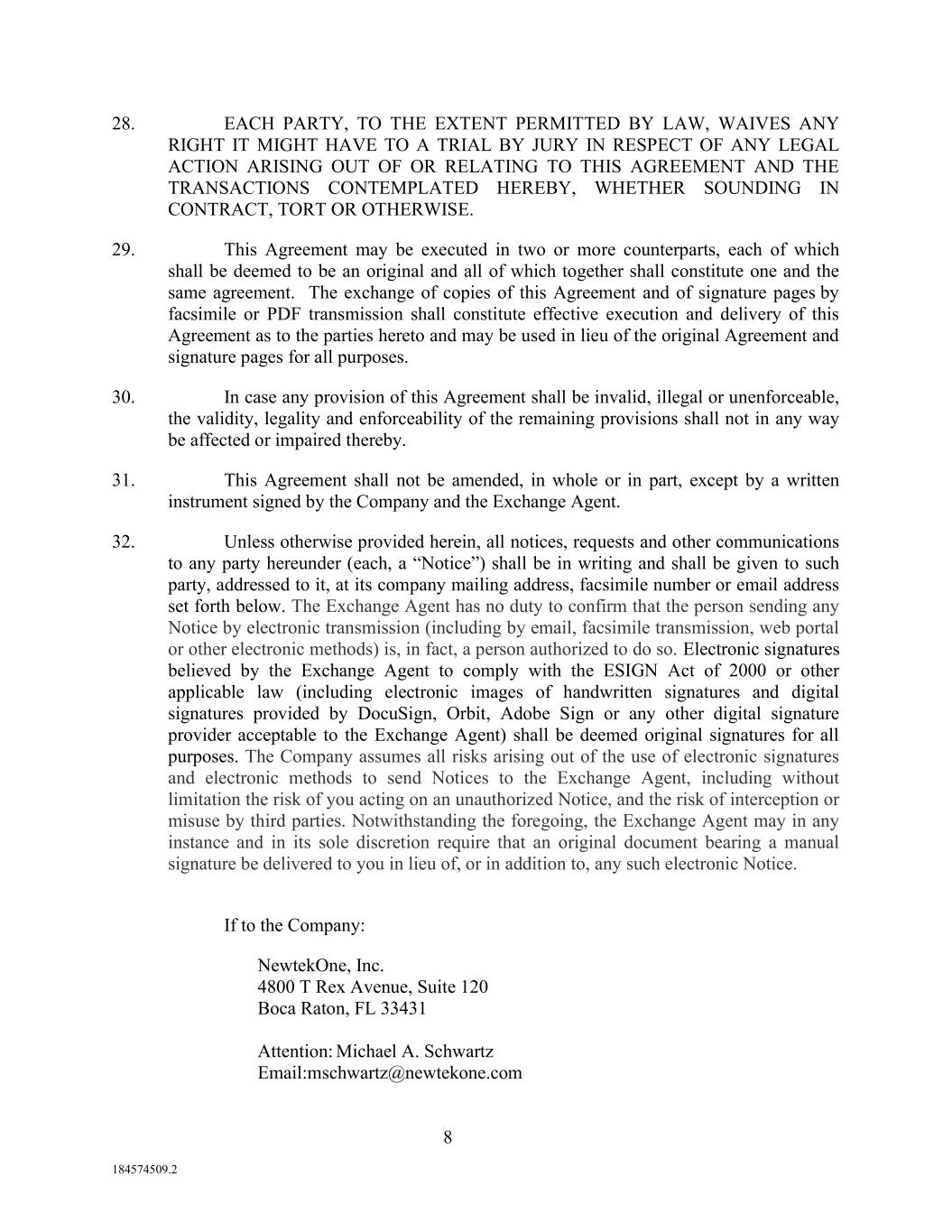 8 184574509.2 28. EACH PARTY, TO THE EXTENT PERMITTED BY LAW, WAIVES ANY RIGHT IT MIGHT HAVE TO A TRIAL BY JURY IN RESPECT OF ANY LEGAL ACTION ARISING OUT OF OR RELATING TO THIS AGREEMENT AND THE TRANSACTIONS CONTEMPLATED HEREBY, WHETHER SOUNDING IN CONTRACT, TORT OR OTHERWISE. 29. This Agreement may be executed in two or more counterparts, each of which shall be deemed to be an original and all of which together shall constitute one and the same agreement. The exchange of copies of this Agreement and of signature pages by facsimile or PDF transmission shall constitute effective execution and delivery of this Agreement as to the parties hereto and may be used in lieu of the original Agreement and signature pages for all purposes. 30. In case any provision of this Agreement shall be invalid, illegal or unenforceable, the validity, legality and enforceability of the remaining provisions shall not in any way be affected or impaired thereby. 31. This Agreement shall not be amended, in whole or in part, except by a written instrument signed by the Company and the Exchange Agent. 32. Unless otherwise provided herein, all notices, requests and other communications to any party hereunder (each, a “Notice”) shall be in writing and shall be given to such party, addressed to it, at its company mailing address, facsimile number or email address set forth below. The Exchange Agent has no duty to confirm that the person sending any Notice by electronic transmission (including by email, facsimile transmission, web portal or other electronic methods) is, in fact, a person authorized to do so. Electronic signatures believed by the Exchange Agent to comply with the ESIGN Act of 2000 or other applicable law (including electronic images of handwritten signatures and digital signatures provided by DocuSign, Orbit, Adobe Sign or any other digital signature provider acceptable to the Exchange Agent) shall be deemed original signatures for all purposes. The Company assumes all risks arising out of the use of electronic signatures and electronic methods to send Notices to the Exchange Agent, including without limitation the risk of you acting on an unauthorized Notice, and the risk of interception or misuse by third parties. Notwithstanding the foregoing, the Exchange Agent may in any instance and in its sole discretion require that an original document bearing a manual signature be delivered to you in lieu of, or in addition to, any such electronic Notice. If to the Company: NewtekOne, Inc. 4800 T Rex Avenue, Suite 120 Boca Raton, FL 33431 Attention: Michael A. Schwartz Email:mschwartz@newtekone.com