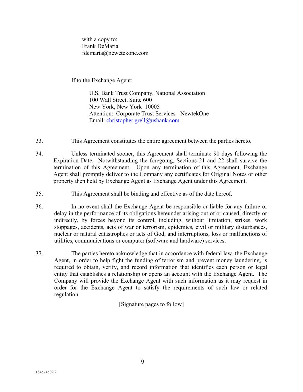 9 184574509.2 with a copy to: Frank DeMaria fdemaria@newetekone.com If to the Exchange Agent: U.S. Bank Trust Company, National Association 100 Wall Street, Suite 600 New York, New York 10005 Attention: Corporate Trust Services - NewtekOne Email: christopher.grell@usbank.com 33. This Agreement constitutes the entire agreement between the parties hereto. 34. Unless terminated sooner, this Agreement shall terminate 90 days following the Expiration Date. Notwithstanding the foregoing, Sections 21 and 22 shall survive the termination of this Agreement. Upon any termination of this Agreement, Exchange Agent shall promptly deliver to the Company any certificates for Original Notes or other property then held by Exchange Agent as Exchange Agent under this Agreement. 35. This Agreement shall be binding and effective as of the date hereof. 36. In no event shall the Exchange Agent be responsible or liable for any failure or delay in the performance of its obligations hereunder arising out of or caused, directly or indirectly, by forces beyond its control, including, without limitation, strikes, work stoppages, accidents, acts of war or terrorism, epidemics, civil or military disturbances, nuclear or natural catastrophes or acts of God, and interruptions, loss or malfunctions of utilities, communications or computer (software and hardware) services. 37. The parties hereto acknowledge that in accordance with federal law, the Exchange Agent, in order to help fight the funding of terrorism and prevent money laundering, is required to obtain, verify, and record information that identifies each person or legal entity that establishes a relationship or opens an account with the Exchange Agent. The Company will provide the Exchange Agent with such information as it may request in order for the Exchange Agent to satisfy the requirements of such law or related regulation. [Signature pages to follow]