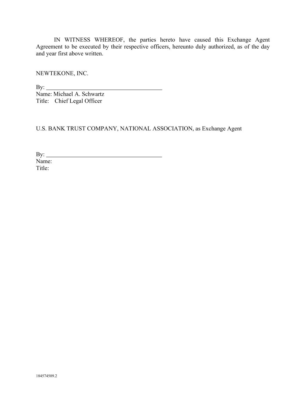 184574509.2 IN WITNESS WHEREOF, the parties hereto have caused this Exchange Agent Agreement to be executed by their respective officers, hereunto duly authorized, as of the day and year first above written. NEWTEKONE, INC. By: Name: Michael A. Schwartz Title: Chief Legal Officer U.S. BANK TRUST COMPANY, NATIONAL ASSOCIATION, as Exchange Agent By: Name: Title: